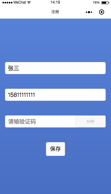 微信小程序注冊完整實例,發送短信驗證碼,帶60秒倒計時功能,無需服務器端。效果圖: