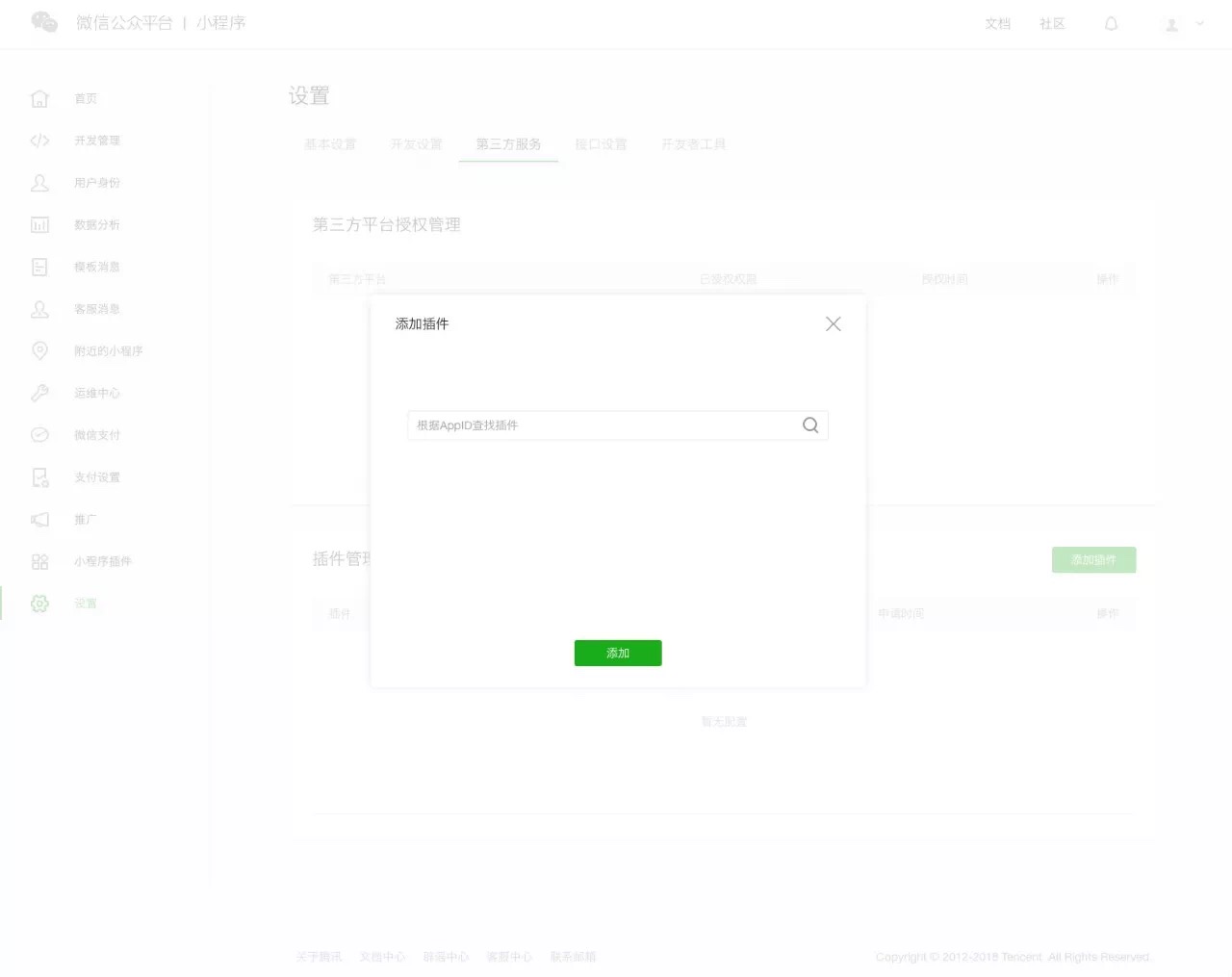 使用第三方插件之前,需要進入微信小程序開發者后臺,在第三方服務里添加插件: